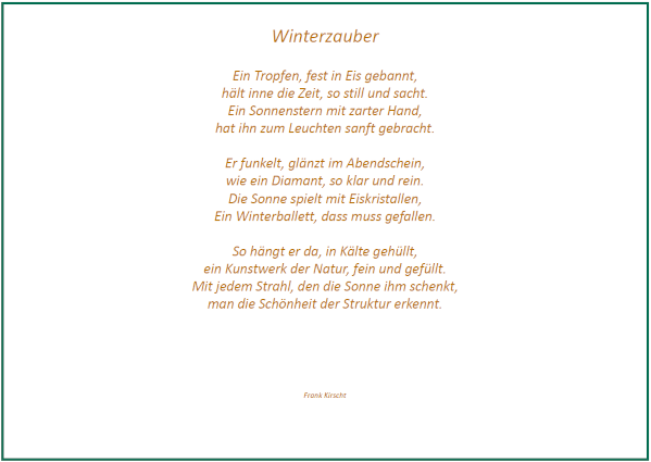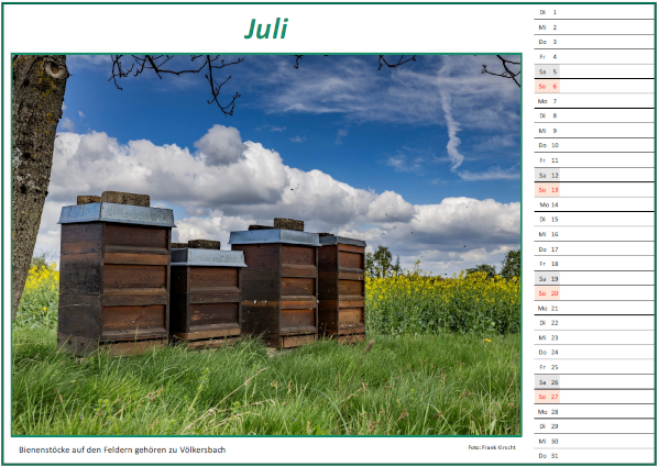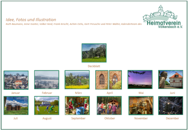 Passend zu diesem Titel sind auf allen zwölf Kalenderblättern Motive abgebildet, die eine direkte Beziehung zu Völkersbach aufzeigen oder ortsbildprägende Ansichten darstellen. Auf den Rückseiten der Blätter sind zum einen nähere Erläuterungen dazu beschrieben, zum anderen sehr treffende, stilvolle Gedichte zu den jeweiligen Abbildungen abgedruckt.