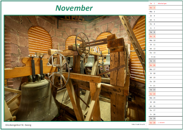 Die Sicht vom früheren Gasthaus Lamm zum Rathaus, das Zweikanthaus in der Brunnenstraße und auch die Inschrift auf dem Henhöfer-Haus zeugen von vergangenen Zeiten des Dorfes und die entsprechenden Texte befassen sich mit den Details dazu. Auch eine Aufnahme der St. Georg-Kirche aus einer außergewöhnlichen Perspektive ist im Kalender festgehalten.